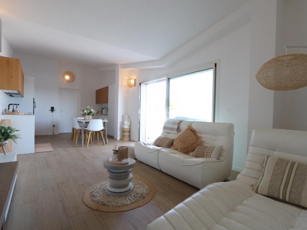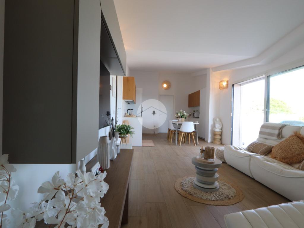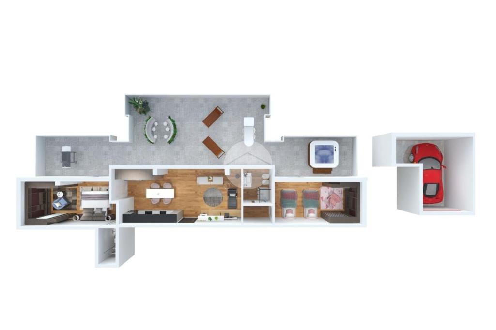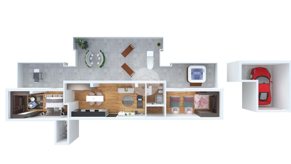 L'appartamento si compone di un luminoso open space che si sviluppa in lunghezza, dove a destra troviamo la zona salotto e conversazione, mentre a sinistra la cucina e il tavolo da pranzo. Ai lati della zona living sorgono rispettivamente una camera matrimoniale con cabina armadio e bagno en suite e una camera doppia con bagno principale.
