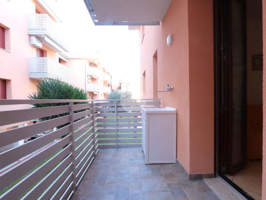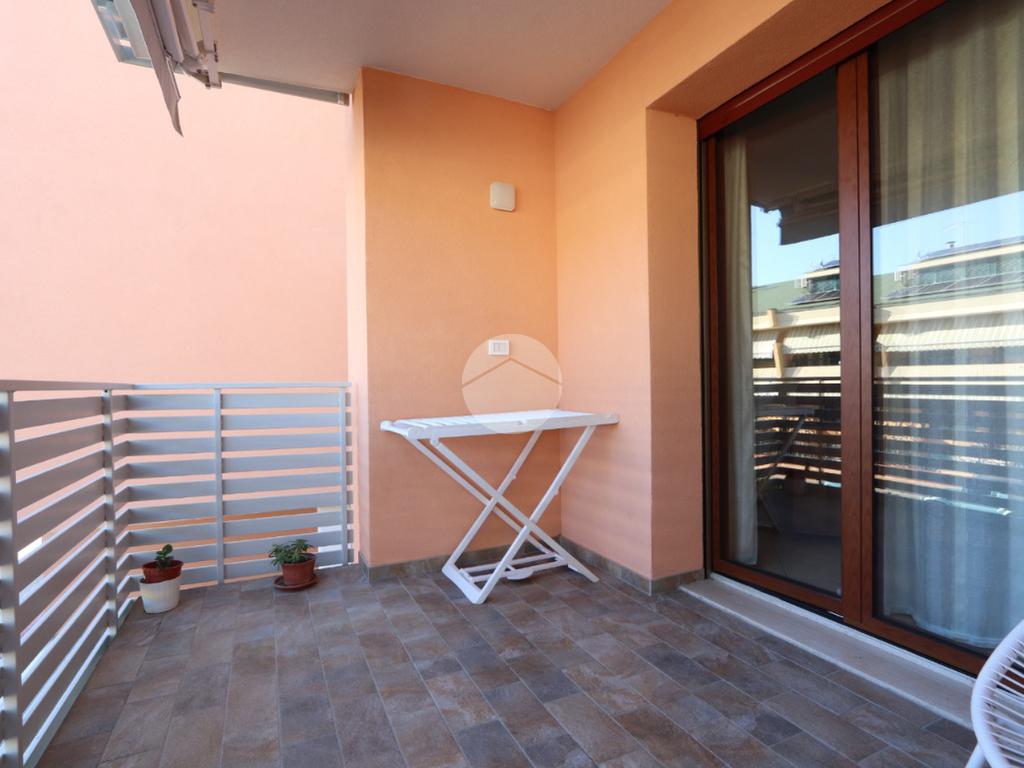 Il portone d'ingresso ci introduce in un bel salotto con terrazzo coperto e accessoriato con una tenda da sole manuale e cucina abitabile con secondo balconcino di servizio.