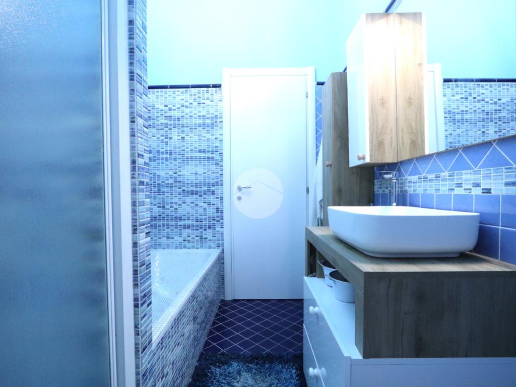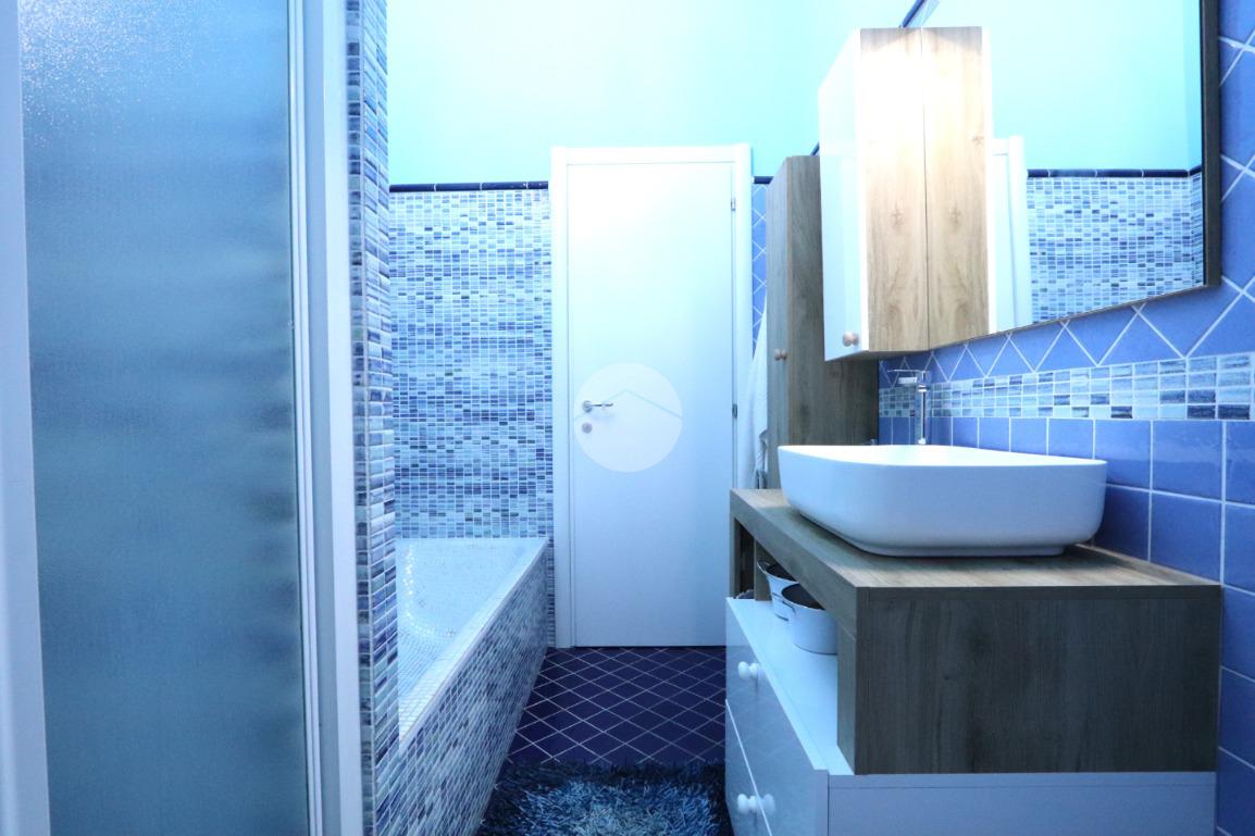 Un bagno interamente rivestito in mosaico con doccia, vasca e finestra completa la zona notte.